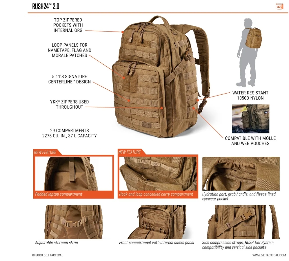 RUSH® 24 2.0-ryggsekken har blitt forbedret med ekstra funksjoner, som et polstret futteral til bærbar PC, mer plass til briller, doble topplommer med innvendige glidelommer og en skjult lomme til CCW. Disse forbedringene gjør den enda mer tilpasningsdyktig og praktisk til daglig bruk.
