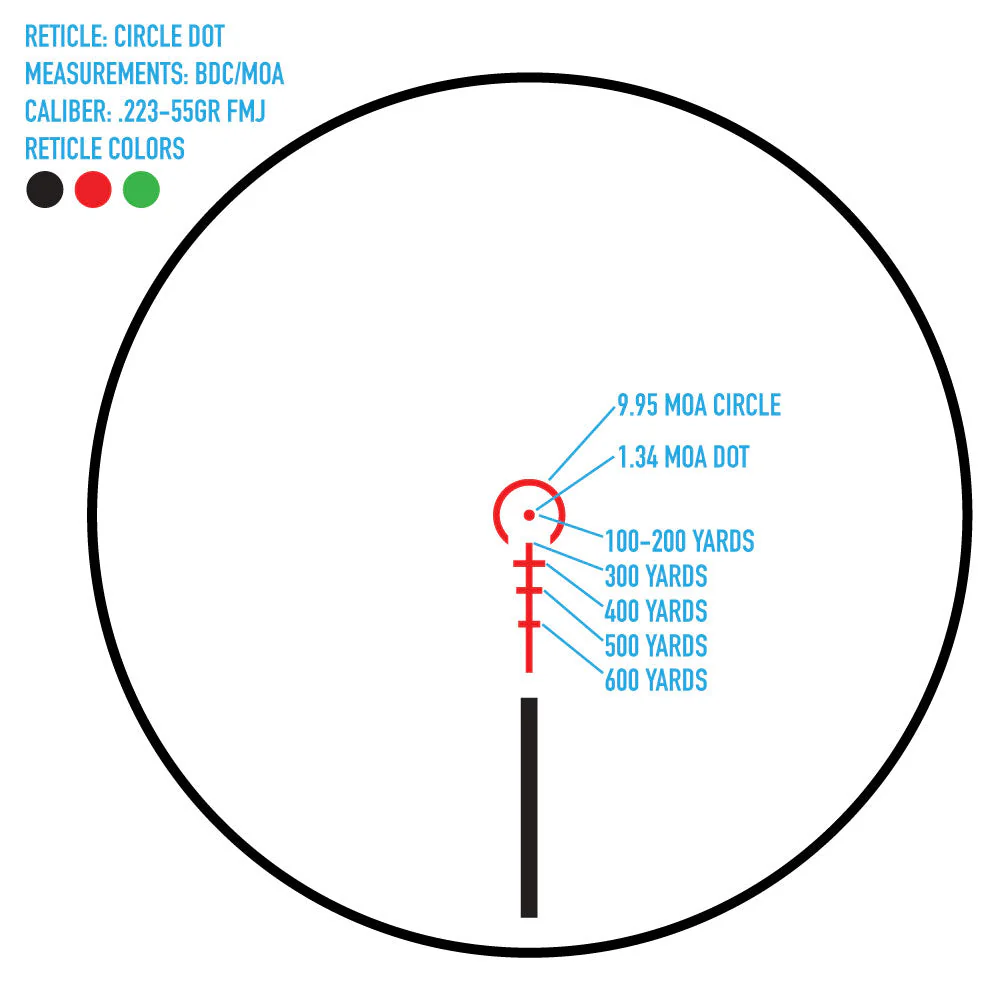 | Trådkorsfarge | Rød, grønn og svart |